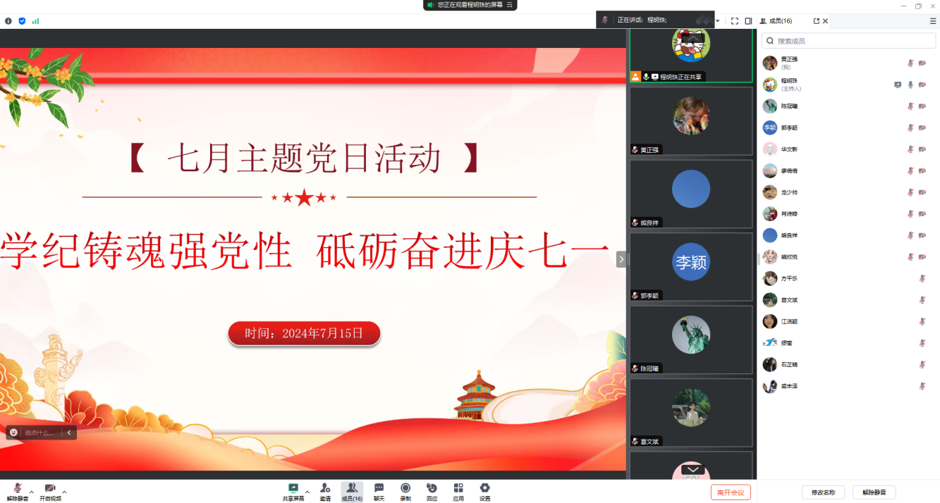 为庆祝中国共产党成立103周年,弘扬伟大建党精神,贯彻落实新时代党的建设总要求,进一步健全全面从严治党体系推动党纪学习教育走深走实,beat365官方网站第二党支部于7月15日召开线上会议,开展了“学纪铸魂强党性 砥砺奋进庆七一”主题党日活动。