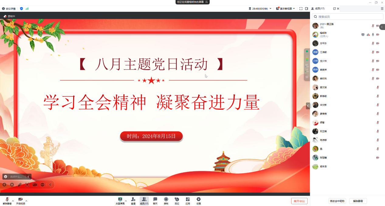 为深入学习贯彻党的二十届三中全会精神,感悟革命历史,强化爱国情怀和使命感,激励党员同志勇毅前行,争当先锋,beat365官方网站第二党支部于8月15日召开线上会议,开展了“学习全会精神 凝聚奋进力量”主题党日活动。