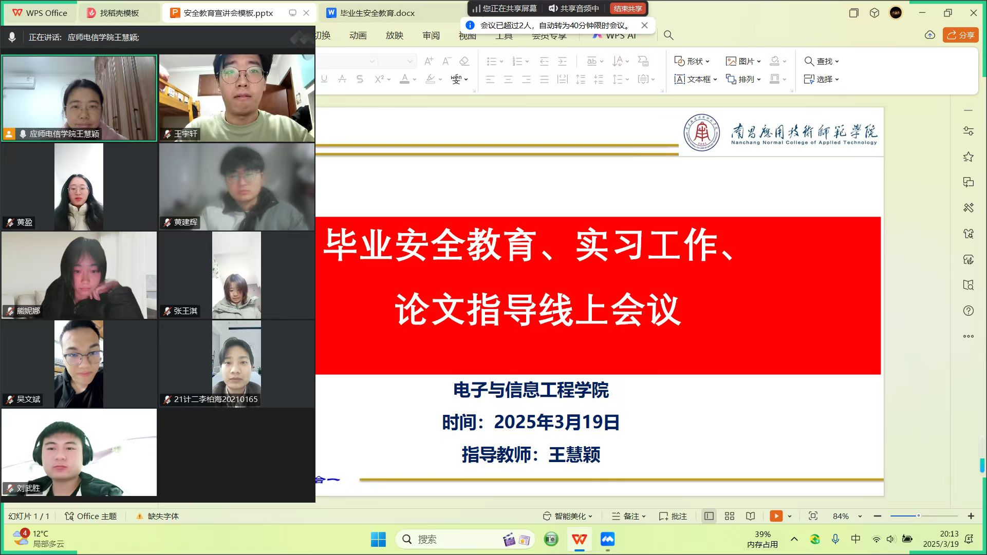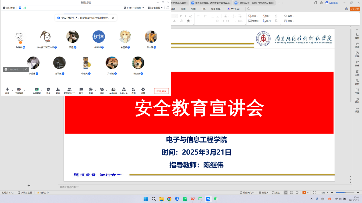 为切实做好2025届毕业生安全教育工作,增强学生安全意识,保障学生顺利完成学业及就业,电子与信息工程学院于2025年3月18日—3月23日通过线上形式组织开展2025届毕业生安全教育会。会议围绕毕业论文、毕业实习安全、就业指导三个方面展开,全体毕业生与相关指导教师参加了本次会议。