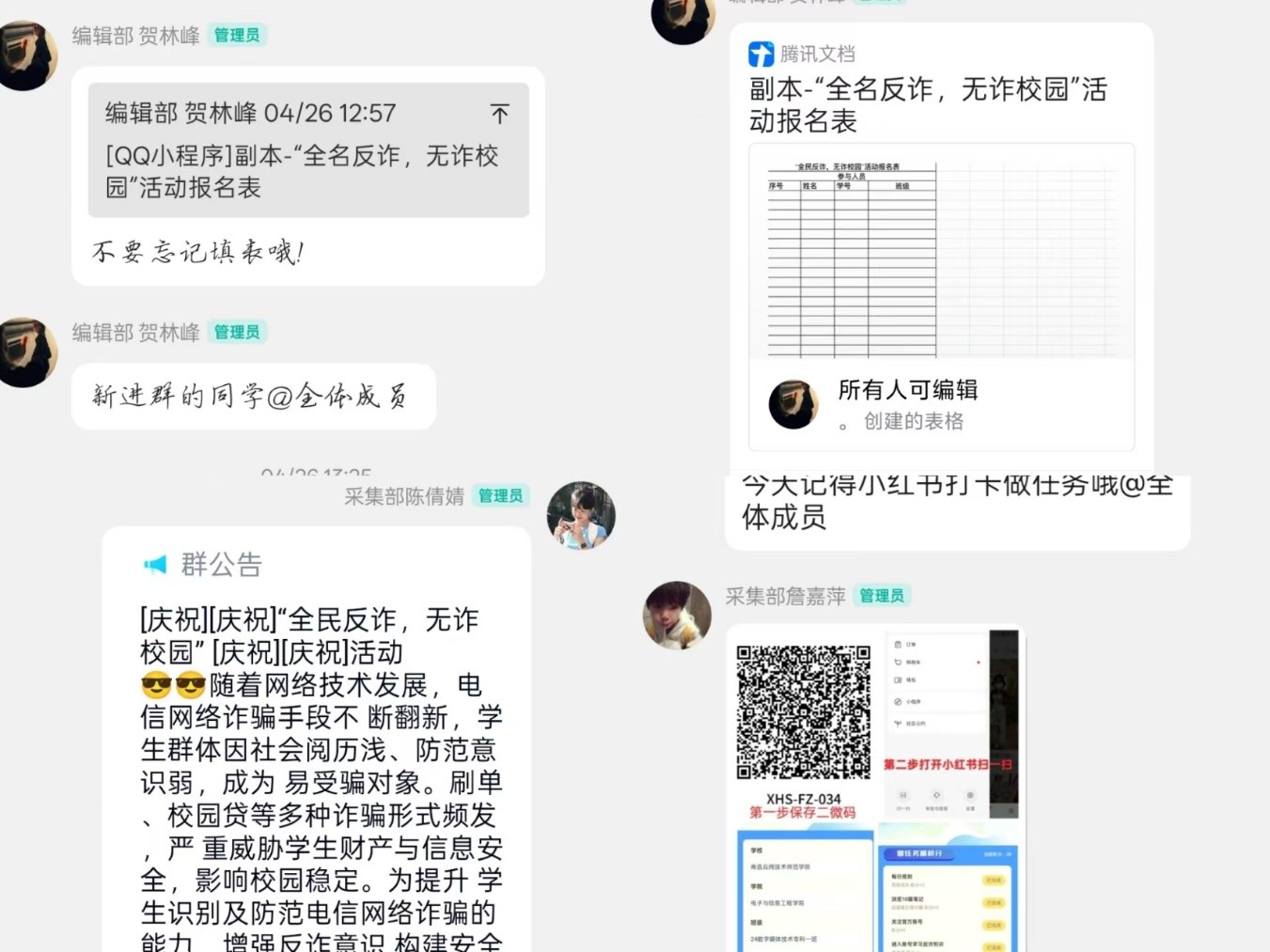 活动伊始,为保障活动的顺利开展,准备工作从平台准备、签到指引、技术保障等多方面精心规划。在工作人员的指引下,参与活动的同学们快速掌握了打卡签到的基本操作流程,能够独立自主地进行反诈学习与经验分享和教训总结,同时在活动期间工作人员及时并有效地为各位同学们提醒打卡事宜与解答有关疑惑。