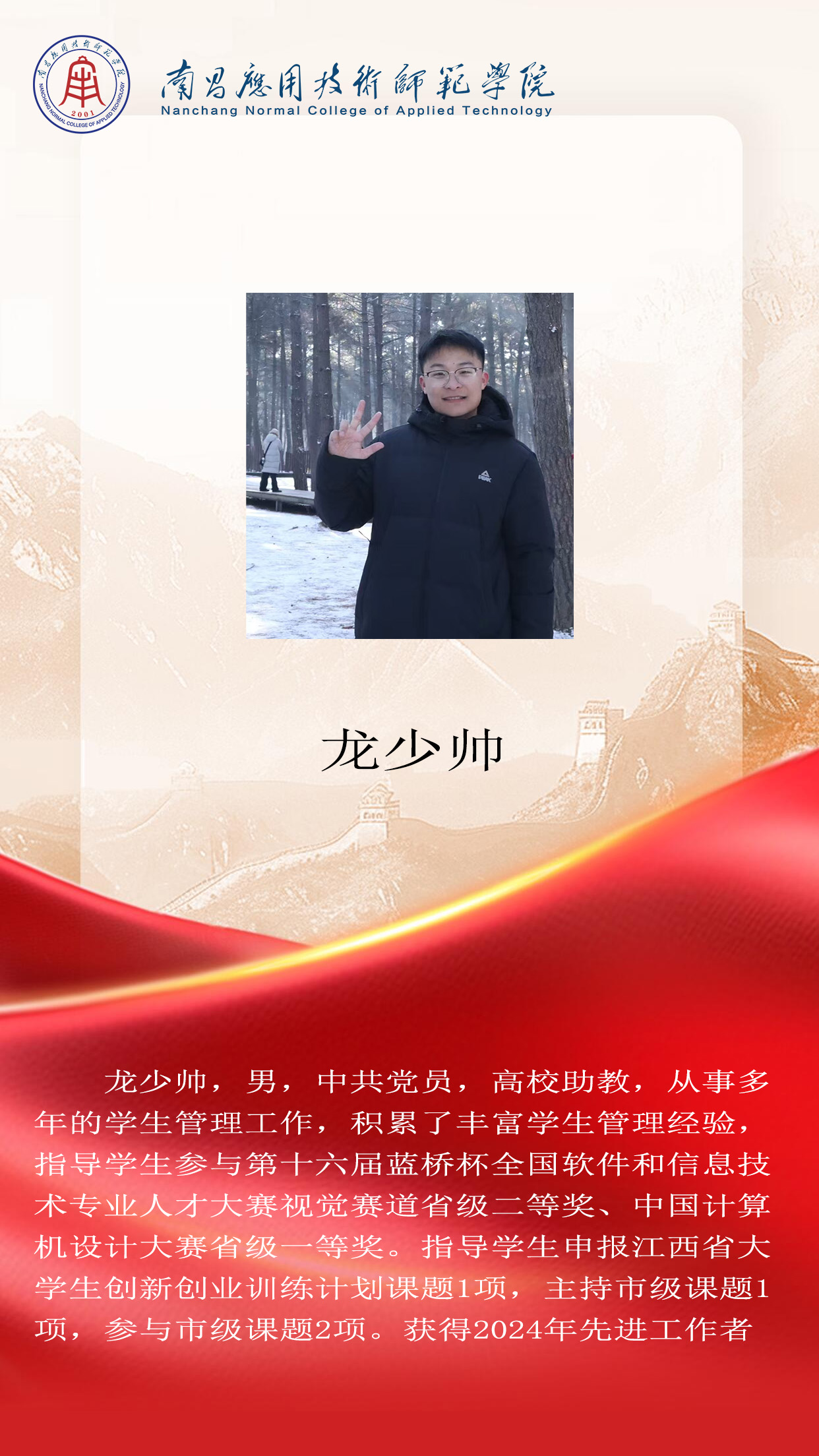 先进典型 优秀毕业生 优秀学生风采 优秀教职工 您现在的位置是:首页 > 先进典型 > 优秀教职工 龙少帅 先进工作者 管理员2025-06-16869 上一篇 刘硕 数字媒体系主任 下一篇 张扬 工程技术系主任