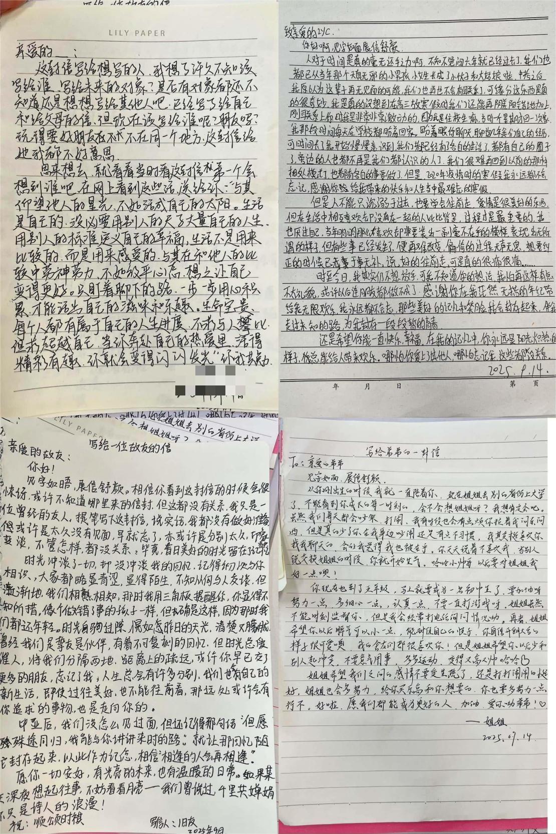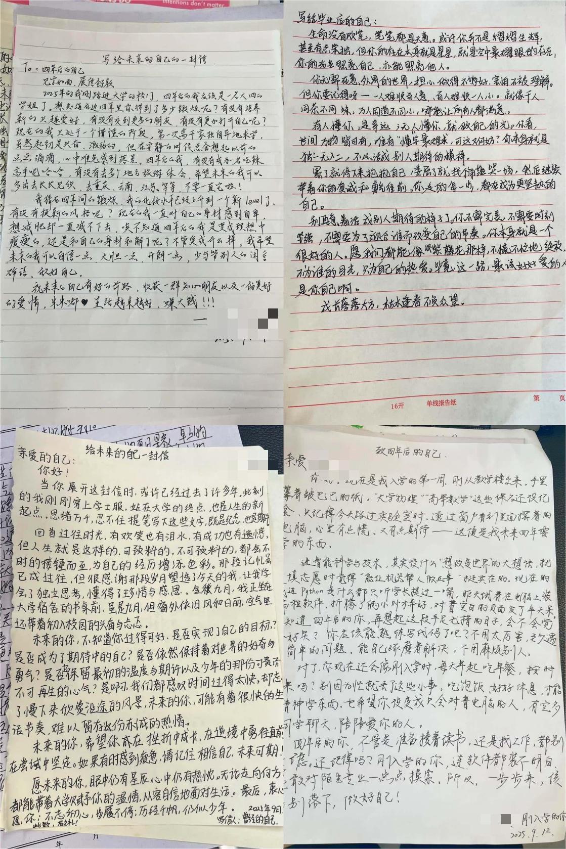 致信自我,书写成长与期许。“写给自己的一封信” 则成为学生们与内心对话的 “时光胶囊”。信中,大家或复盘入学以来的收获与困惑,或立下未来的目标,还有人用温柔的笔触鼓励正处于迷茫期的自己,这类书信创作能帮助学生梳理成长轨迹,明确人生方向,是一种极具意义的自我心理疏导方式,同时也让同学们的内心变得更加丰盈。