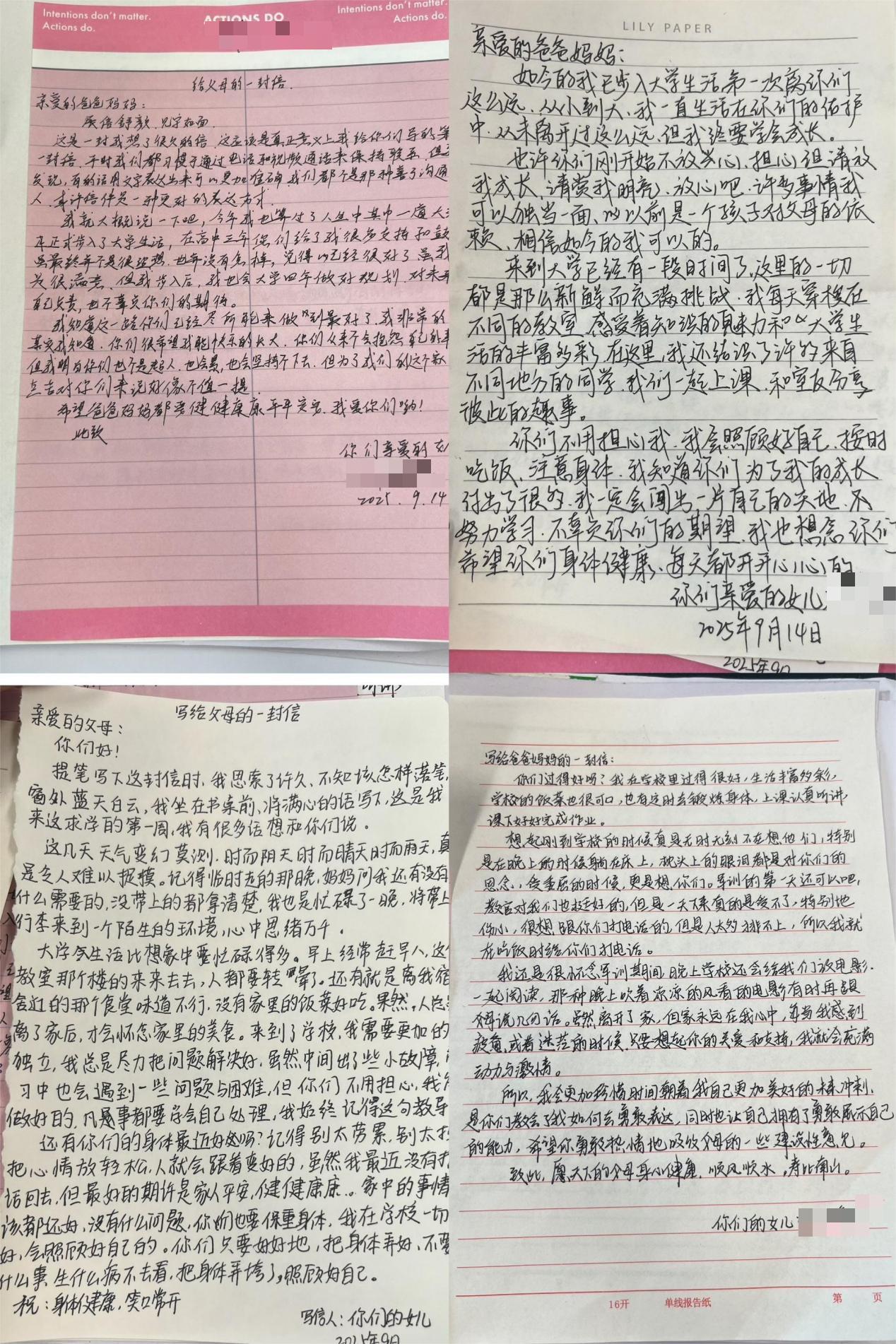为引导学生在快节奏的数字时代重拾笔墨温情,深化自我认知、感恩意识与情感联结,beat365精心策划并举办了 “写给父母的一封信”“写给自己的一封信”“写给重要的人的一封信” 三合一主题书信创作活动。活动自启动以来,获得了大部分学生的积极响应,字里行间满含新生对大学的期待、对情感的珍视与对自我的期许,成为学院助力新生适应校园生活的温暖注脚。