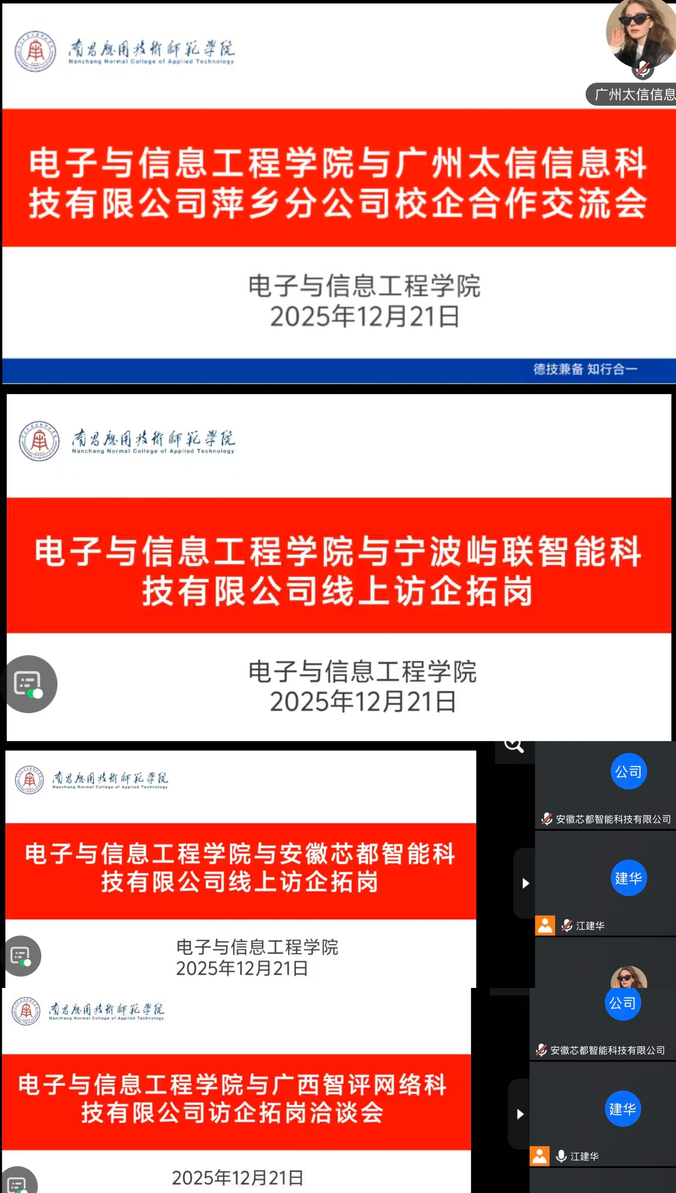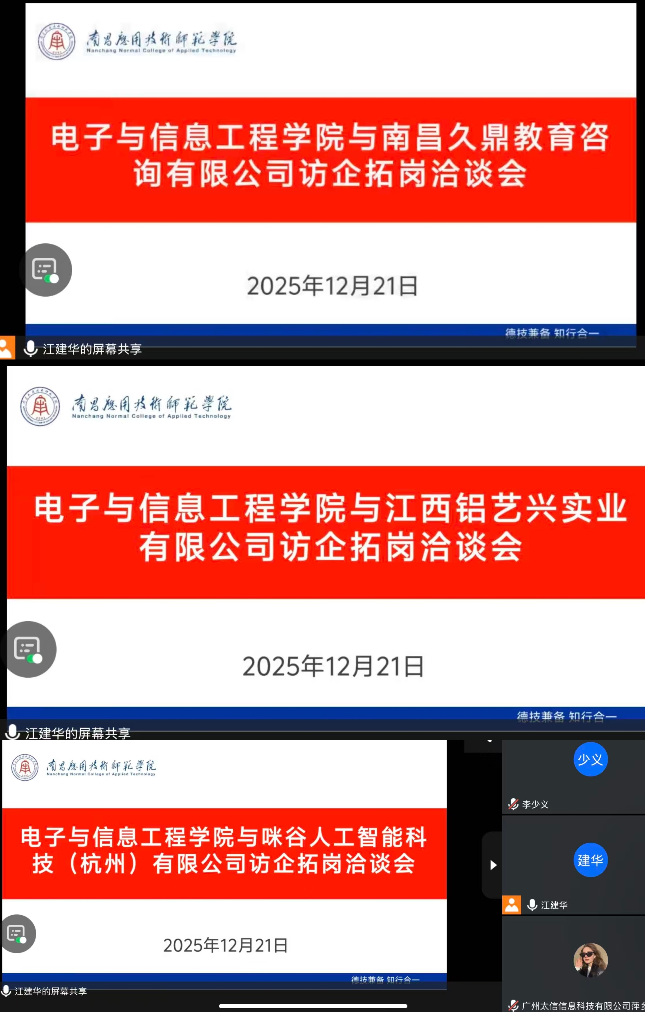 为深入贯彻落实党中央、国务院关于高校毕业生就业工作的决策部署,精准对接行业需求,拓宽毕业生就业渠道,12月21日,beat365官方网站组织开展线上访企拓岗专项行动。校长助理李少义、学院党总支书记江建华先后与广州太信信息科技有限公司萍乡分公司、宁波屿联智能科技有限公司、安徽芯都智能科技有限公司、广西智评网络科技有限公司、南昌久鼎教育咨询有限公司、江西铝艺兴实业有限公司、咪谷人工智能科技(杭州)有限公司等7家行业头部企业、重点用人单位进行线上座谈交流,深化产教融合、校企合作,为毕业生高质量就业注入强劲动力。