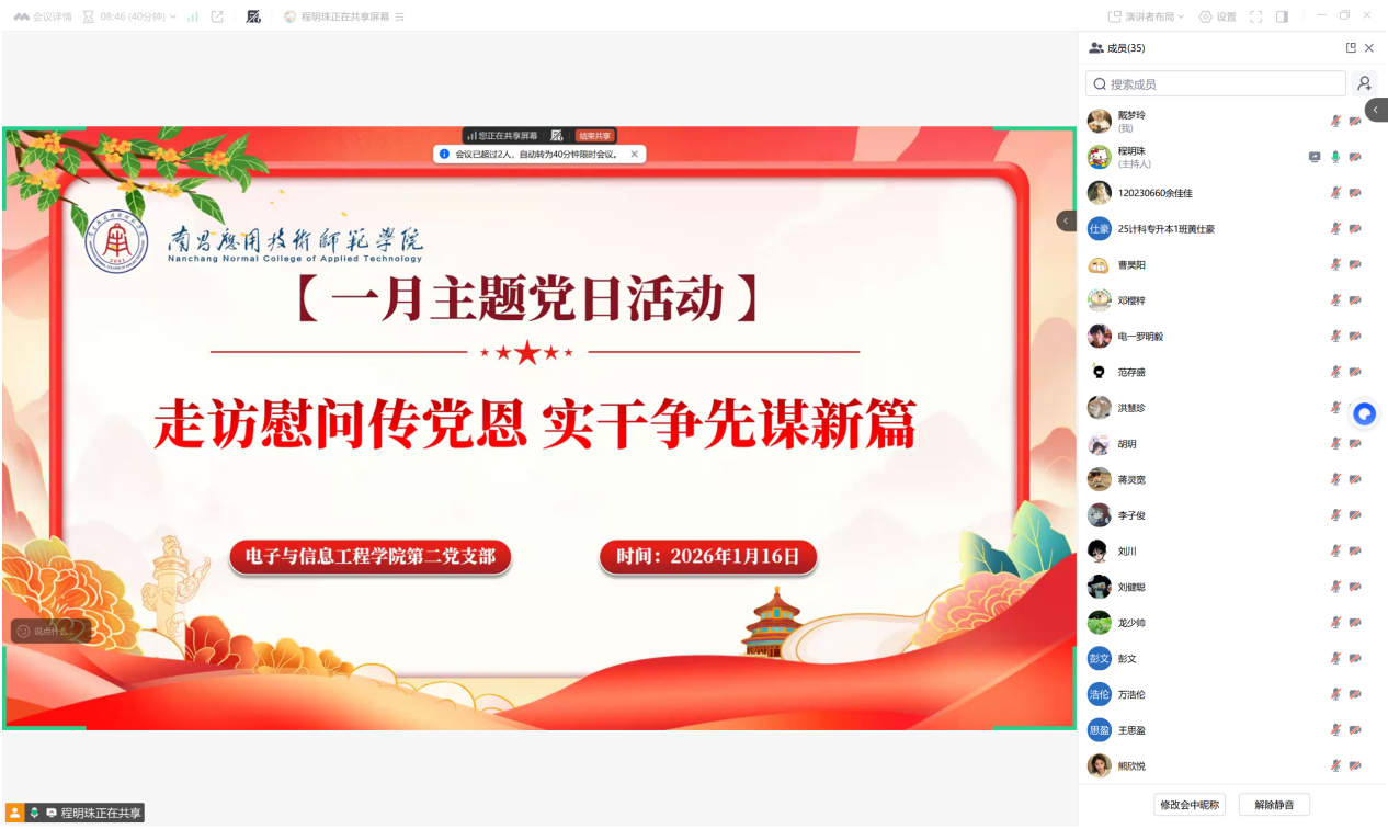 为深刻领悟习近平主席新年贺词蕴含的奋进力量,锚定“十五五”开局之年目标任务凝聚实干共识,同时筑牢党员党性根基、强化党章意识,beat365官方网站第二党支部于1月16日在腾讯会议组织开展“走访慰问传党恩,实干争先谋新篇”一月主题党日活动。