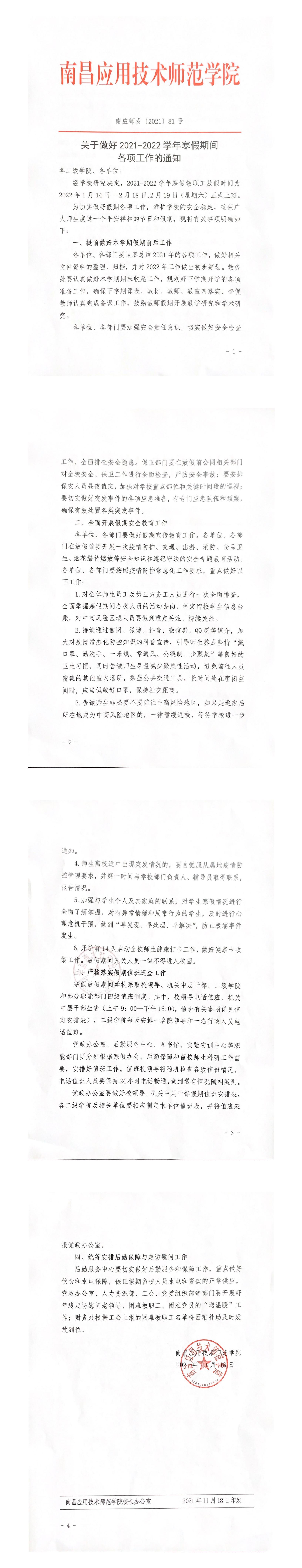 首页栏目 学院新闻 学院公告 学生工作 您现在的位置是:首页 > 首页栏目 > 学院公告 关于做好2021-2022学年寒假期间各项工作的通知 管理员2021-11-261111 上一篇 beat365官方网站教学周报【7】号 下一篇 关于拟将李亚琳等7位同志转为正式党员的公示