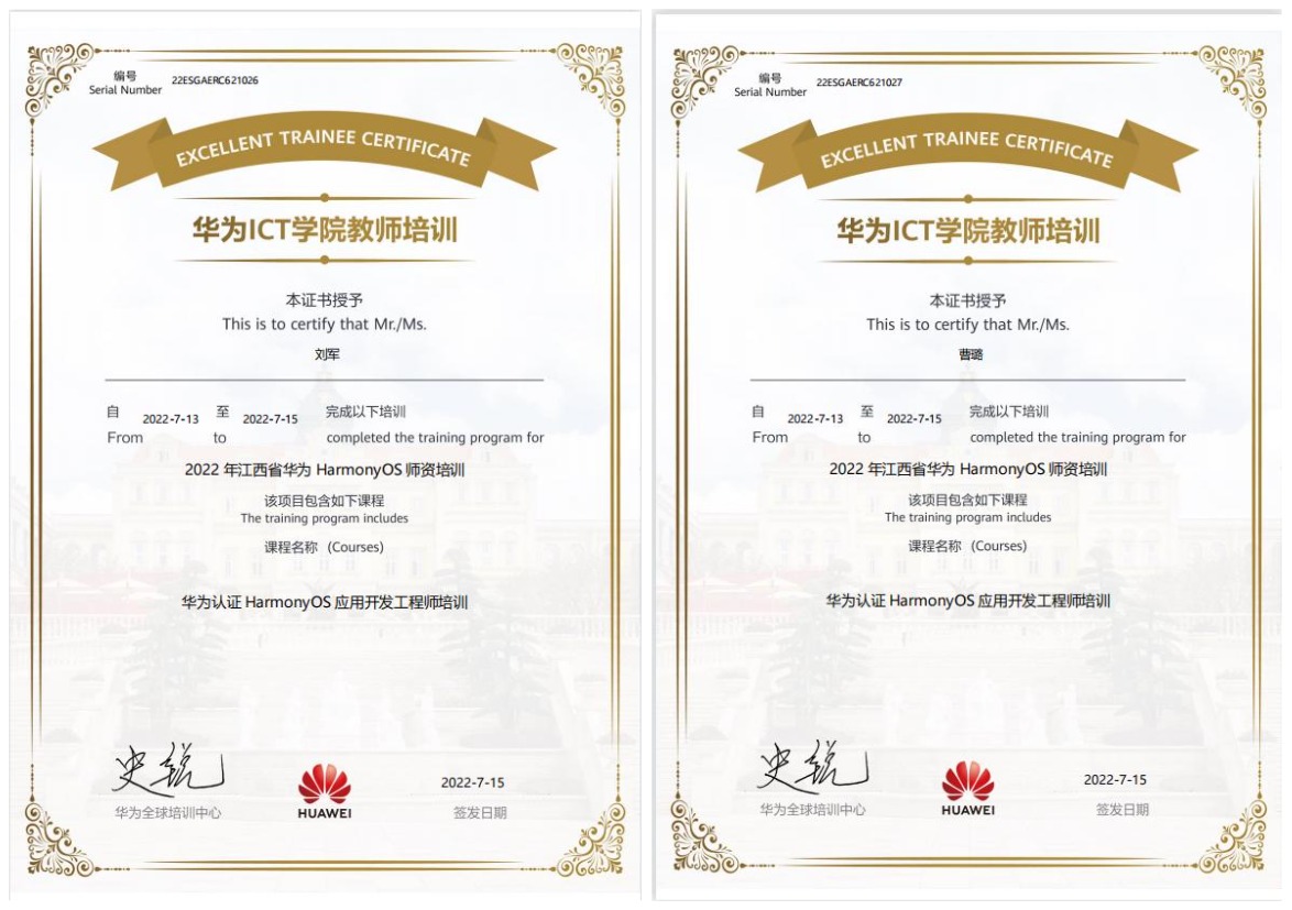 为拓宽教师教学视野,加深对华为HarmonyOS的认识和了解,推进软件工程专业教学改革,7月13日-15日,beat365选派软件工程专业教师刘军、曹璐参加由华为技术有限公司在新余举办的HarmonyOS师资培训。